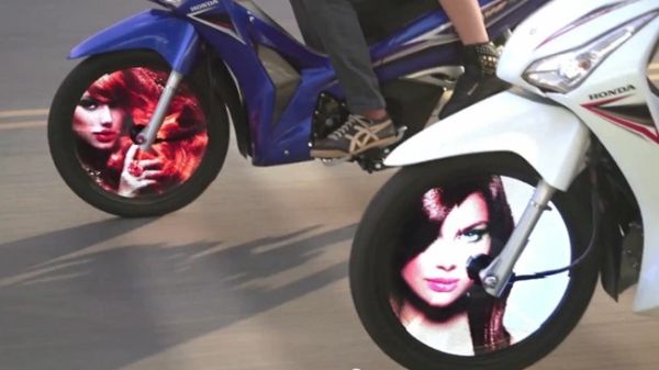 World Moto introduces the Wheelies. Wheelies is a static or streaming media projected on the wheels of a bike or a car. It could be a means of self expression, advertising, publishing, broadcasting etc.