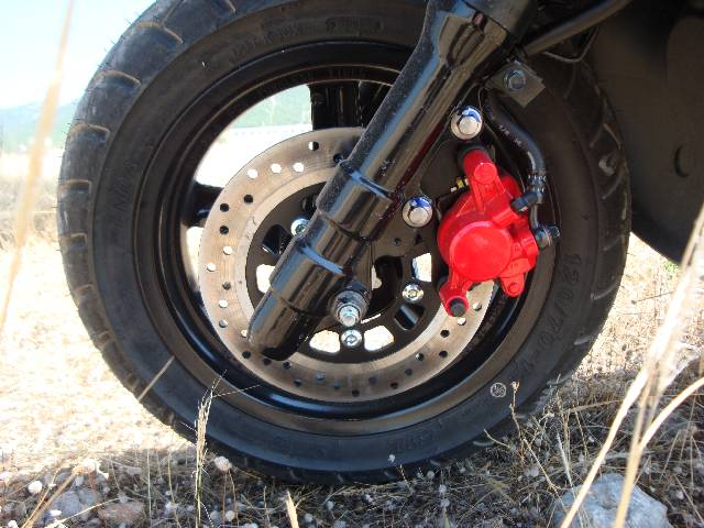 Τα φρένα είναι πολύ καλά. Το μπροστινό δισκόφρενο των 189 χιλ. συνδυάζεται με μονοπίστονη δαγκάνα. Παρέχει δυνατό φρενάρισμα με καλή αίσθηση και καλό αρχικό δάγκωμα.