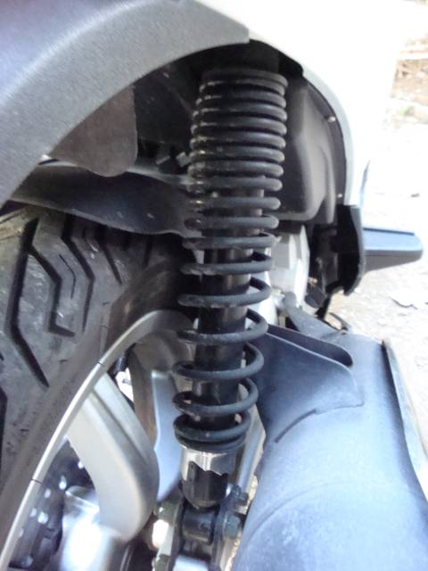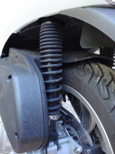 Στο δρόμο: Το πιρούνι των 35 χιλ. παρέχει μέτρια σκληρότητα, τα αμορτισέρ είναι σχετικά μαλακά. Η μόνη δυνατή ρύθμιση για τον αναβάτη είναι η προφόρτιση ελατηρίων στα αμορτισέρ σε τέσσερις θέσεις. Κατά τη δοκιμή του σκούτερ αφέθηκαν στην πιο μαλακή σκάλα.