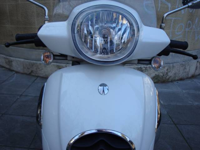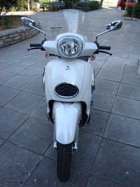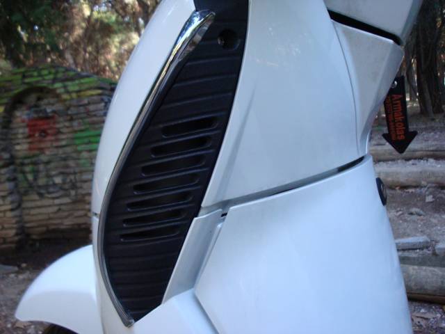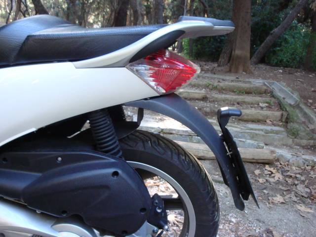 Παρέχεται μόνο το διπλό σταντ, ο γάντζος για τα ψώνια έχει μετακομίσει στο μπροστινό μέρος της σέλας. Τα φλας αν και είναι τοποθετημένα κάτω από το τιμόνι, δείχνουν όμορφα. Η ζελατίνα είναι λίγο ψηλότερη από το συνηθισμένο, αν ο οδηγός σκύψει αρκετά ανεβαίνοντας ή κατεβαίνοντας από το σκούτερ, θα τη χτυπήσει με το κράνος του.