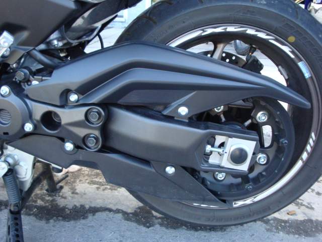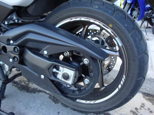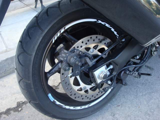 Τα ελαστικά είναι Bridgestone BT-011 με διαστάσεις 120-70-15 μπροστά και 160-60-15 πίσω. Θεωρούνται μια καλή επιλογή για το T-max.