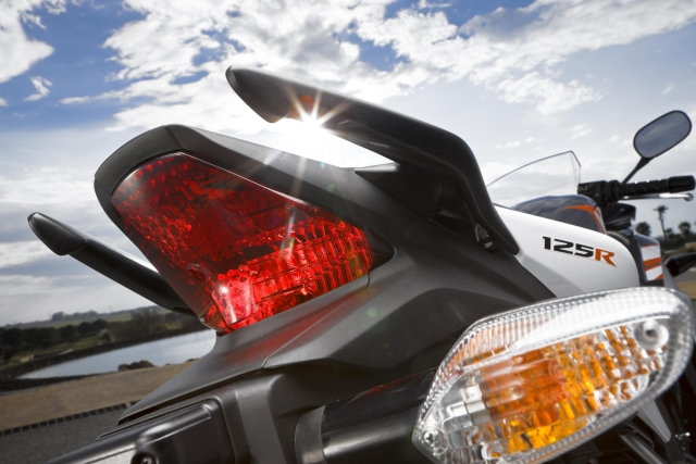 Οι διαστάσεις του CBR έχουν μεγαλώσει σε σχέση με το προηγούμενο μοντέλο, έτσι πλέον είναι ένα κανονικό μοτοσυκλετάκι κι όχι μεγέθους μπρελόκ που ήταν το προηγούμενο. Επιτέλους! Σαν παράδειγμα μοιάζει πολύ σε μέγεθος και σχήμα με το CBR 250 σε μονόχρωμο ή αν έχει τα ίδια γραφικά με το 250. Αν και υποκειμενικό, η έκδοση με τα μοναδικά γραφικά του 125, όπως αυτή της δοκιμής, είναι πολύ πιο όμορφη.