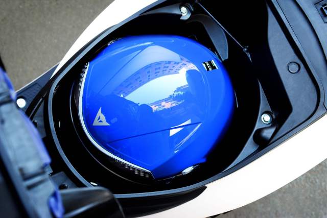 Kάτω από τη σέλα παρέχεται αποθηκευτικός χώρος για ένα full face κράνος. Παρέχεται πλαϊνό και κεντρικό σταντ, γάντζος για τα ψώνια, αλουμινένια σχάρα για μέγιστο βάρος 3 κιλά, το τιμόνι ασφαλίζει κι από τις δύο μεριές και δύο ανοικτοί αποθηκευτικοί χώροι για μικροπράγματα στην ποδιά. Θα ήταν καλύτερα αν παρέχονταν ντουλαπάκι που κλειδώνει στην ποδιά.