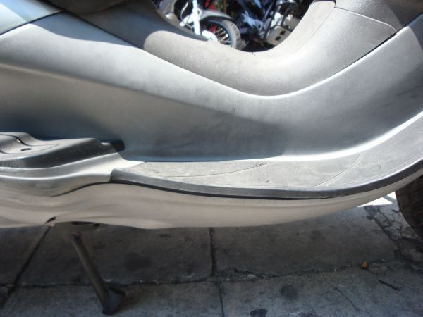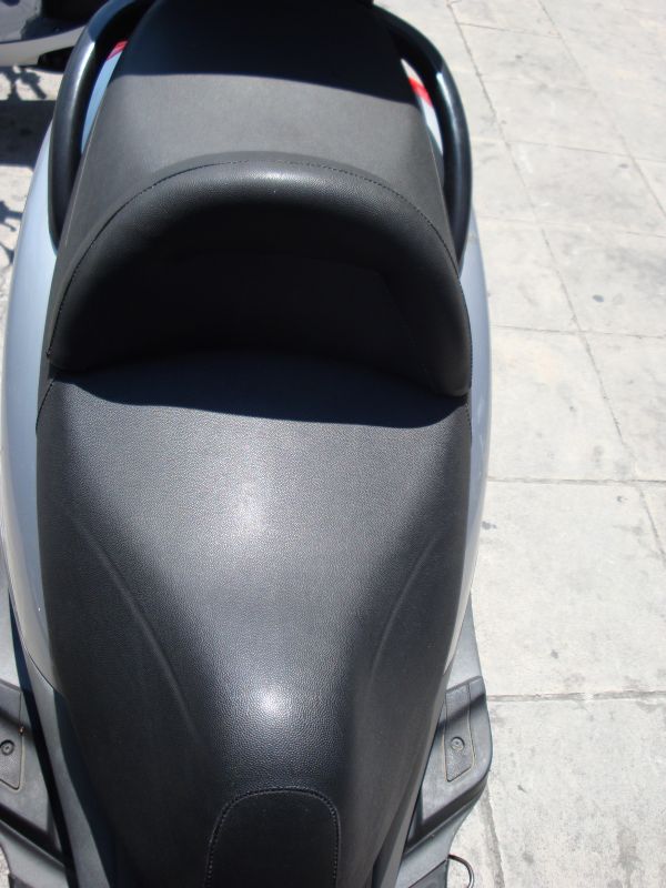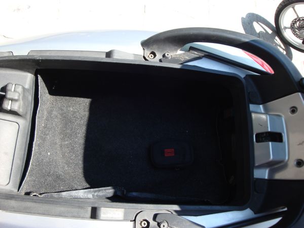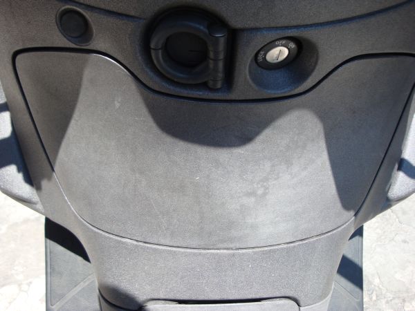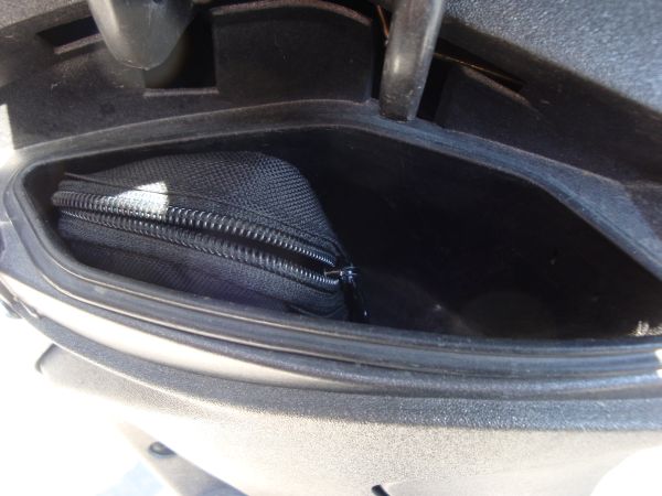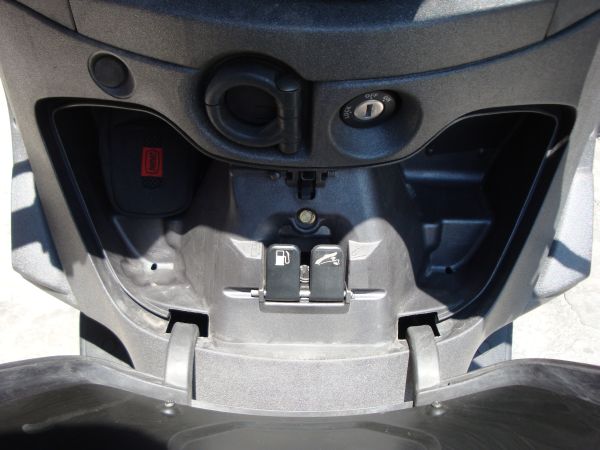 Σχόλια: Υπάρχει μικρός αποθηκευτικός χώρος αριστερά κάτω από το τιμόνι, στη φωτογραφία φαίνεται να φιλοξενεί τη θήκη μιας κάμερας τσέπης. Στο ντουλαπάκι της ποδιάς χωρούν δύο ζευγάρια γάντια ενώ υπάρχουν και διακόπτες για το άνοιγμα της τάπας της βενζίνης και της σέλας. Κάτω από τη σέλα μπορούν ενδεικτικά να φιλοξενηθούν δύο τσάντες supermarket, όχι όμως και κανονικό full face κράνος.