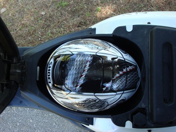 Σχόλια: Το πάτωμα είναι επίπεδο αν και λίγο στενό. Στον αποθηκευτικό χώρο κάτω από τη σέλα δεν χωρά ένα μεγάλο full face κράνος λόγω ύψους, έτσι θα μπορούσαν να χωρέσουν μικρότερα. Στο ντουλαπάκι της ποδιάς μπορεί να φιλοξενηθεί μέχρι κι ένα σετ αδιάβροχα. Υπάρχει μανιβέλα αλλά μόνο κεντρικό σταντ.