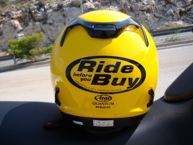 Το χρώμα του κράνους , έντονα κίτρινο και τα ειδικά αυτοκόλλητα, υπενθυμίζουν το συγκεκριμένο χαρακτήρα του κράνους που διατίθεται για δοκιμή. Φυσικά αγοράζοντας το μοντέλο Quantum της Arai, ο μελλοντικός αγοραστής μπορεί να επιλέξει μεταξύ μονόχρωμων ή πολύχρωμων κρανών, κι όχι του συγκεκριμένου κίτρινου, που είναι για τα test rides και μόνο. Υπάρχουν διάφορα μεγέθη στο test ride κράνος.