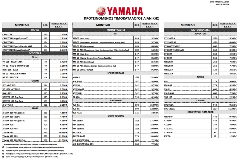 Νέος τιμοκατάλογος δικύκλων ΥΑΜΑΗΑ με ισχύ από σήμερα.
