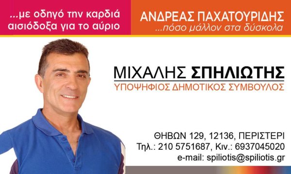 O Μιχάλης Σπηλιώτης υποψήφιος δημοτικός σύμβουλος O Μιχάλης Σπηλιώτης είναι υποψήφιος δημοτικός σύμβουλος για τον Δήμο Περιστερίου με τον συνδυασμό Παχατουρίδη.