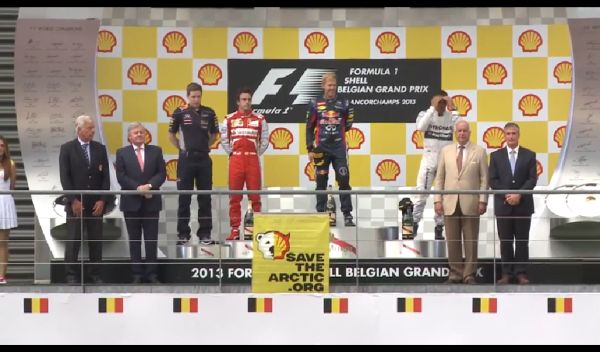 H Greenpeace διαμαρτυρήθηκε εναντίον της Shell στο Βελγικό αγώνα της F1, την Κυριακή 25 Αυγούστου 2013 στα πλαίσια της εκστρατείας Save the Arctic.