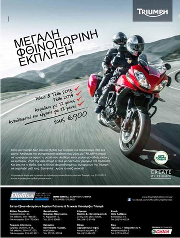 Η μεγάλη φθινοπωρινή προσφορά της Triumph 29/9/2013 H μεγάλη φθινοπωρινή προσφορά της Triumph σημαίνει παροχές έως και 900 € με κάθε καινούρια ταξινόμηση ή αγορά καινούριας μοτοσυκλέτας από 1 Οκτωβρίου έως την 31 Δεκεμβρίου 2013!